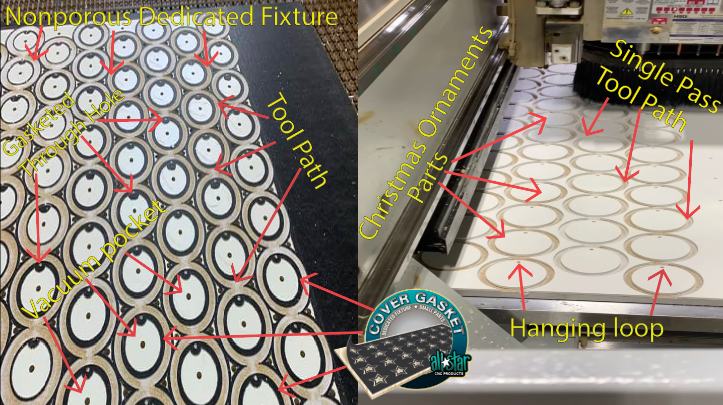 A customer in Colorado was looking to make over 100,000 Christmas ornaments in a short amount of time. Downdraft through an MDF spoil board was slow and tedious as he had to employ onion skins and tabs to hold these parts. By utilizing our SBC CR 0656 to make an air-tight dedicated fixture, this customer was able to get finished parts in a single pass. Notice how he gasketed for the hole in the ornament for the string. This maintains the seal on this part.