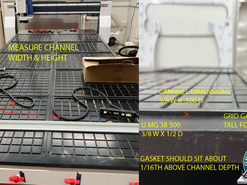 This customer has an Industrial CNC table.The 4’ x 8’ table has a series of 2’ x 2’ zones.Total footage of Grid Gasket needed was 64 feet, 8 feet for each zone.Customer requested a ½” tall gasket (our part UMG 38 500) but turned out to be too tall.When gasket is too tall, it has a tougher time compressing into the channel.Proper gasket size ius essential to produce maximum vacuum performance.