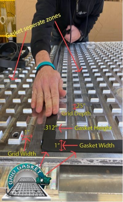 This customer has an Industrial CNC table.The 4’ x 8’ table has a series of 2’ x 2’ zones.Total footage of Grid Gasket needed was 64 feet, 8 feet for each zone.Customer requested a ½” tall gasket (our part UMG 38 500) but turned out to be too tall.When gasket is too tall, it has a tougher time compressing into the channel.Proper gasket size ius essential to produce maximum vacuum performance.